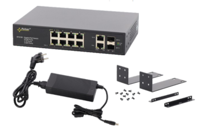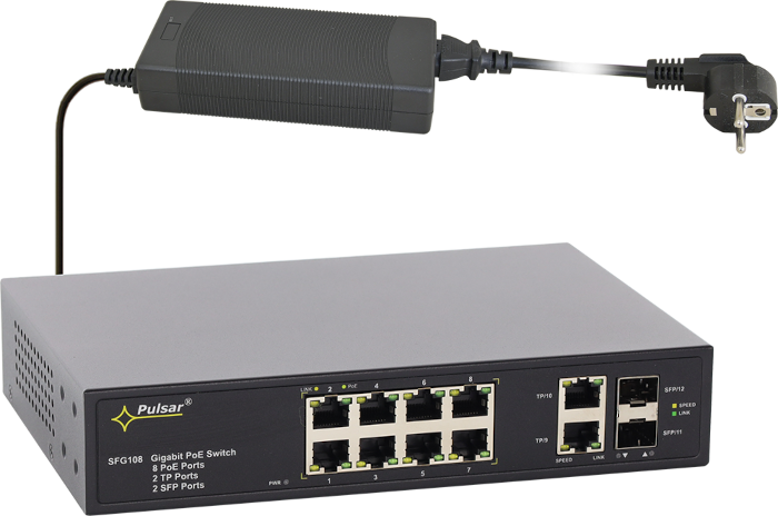 Switch PoE 12-portowy SFG108 firmy Pulsar dedykowany jest do zasilania 8 kamer IP operujących w standardzie IEEE 802.3af/at.