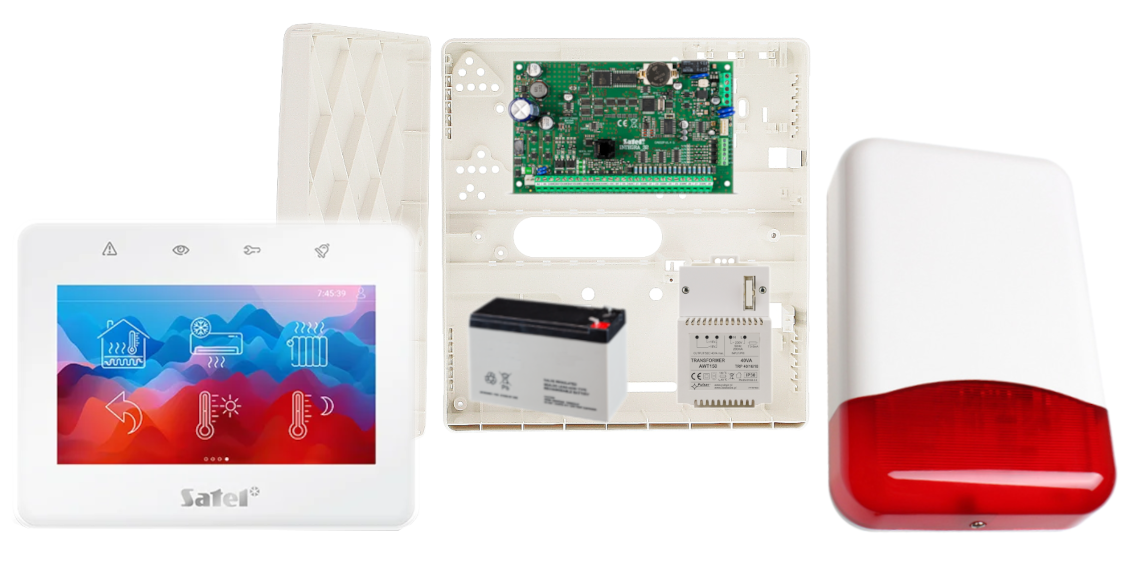 - 1x centrala alarmowa Satel INTEGRA 32 wraz z akcesoriami;