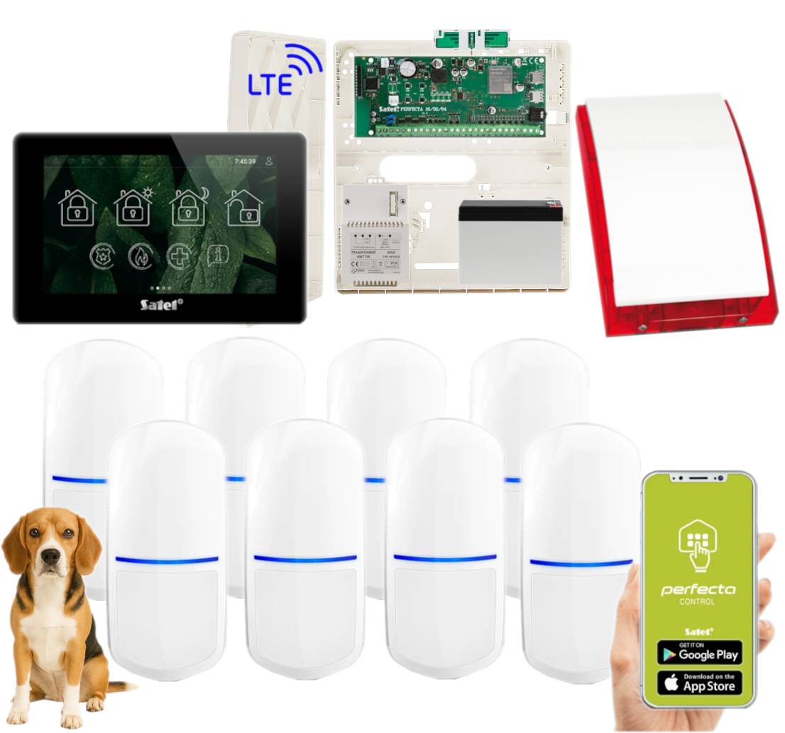 - przewodowa, wewnętrzna czujka ruchu Satel SLIM-PIR-PET (odporność na zwierzęta domowe o wadze do 20kg) - 8 szt;
