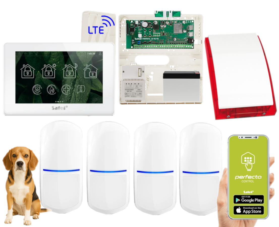 - 4x przewodowa, wewnętrzna czujka ruchu Satel SLIM-PIR-PET (odporność na zwierzęta domowe o wadze do 20kg);