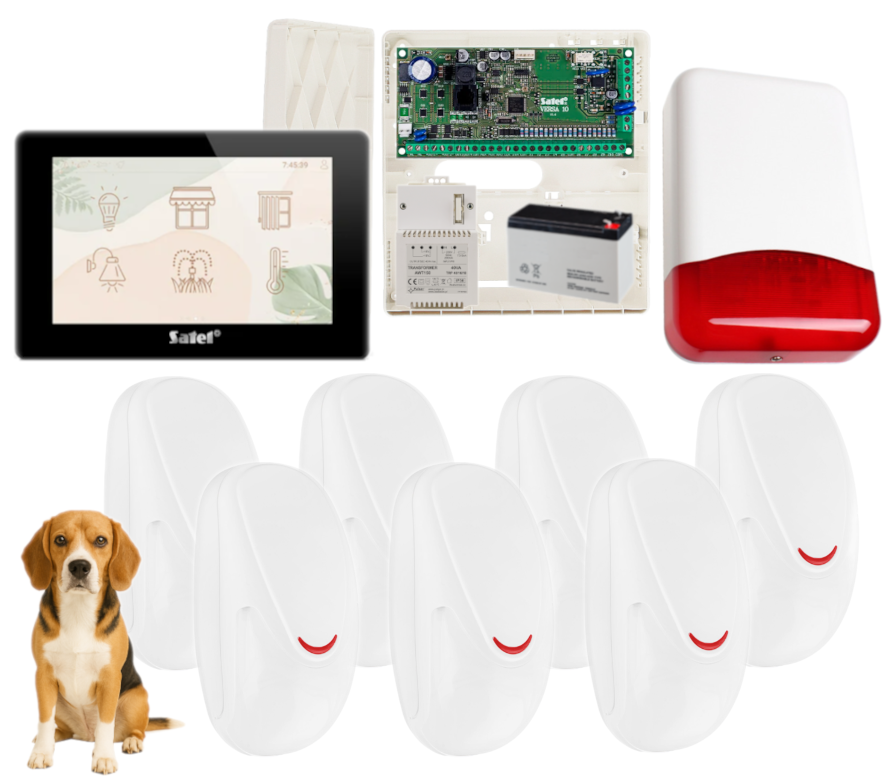 - przewodowa, wewnętrzna czujka ruchu AMC SMILE 21/P (odporna na zwierzęta domowe do 15 kg) – 7 szt;