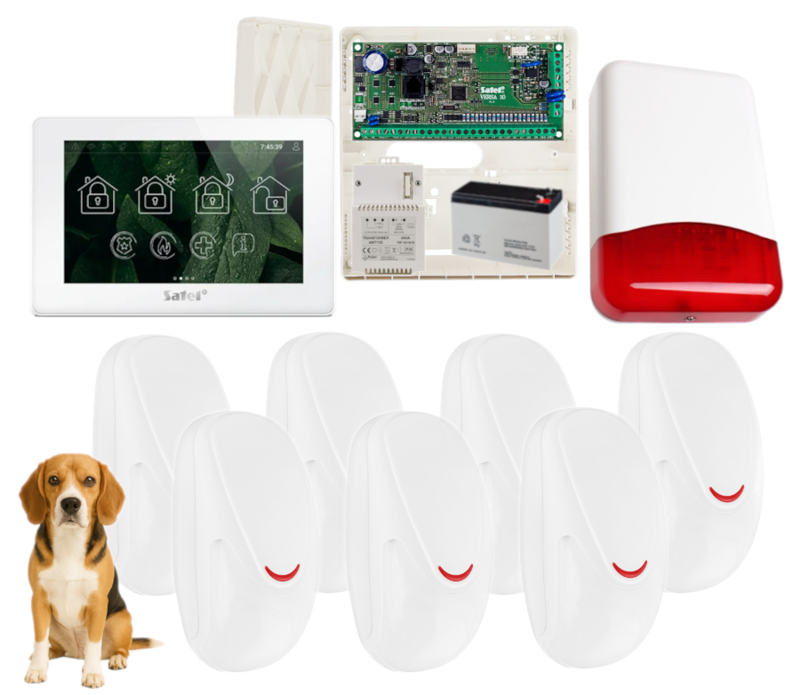 - przewodowa, wewnętrzna czujka ruchu AMC SMILE 21/P (odporna na zwierzęta domowe do 15 kg) – 7 szt;