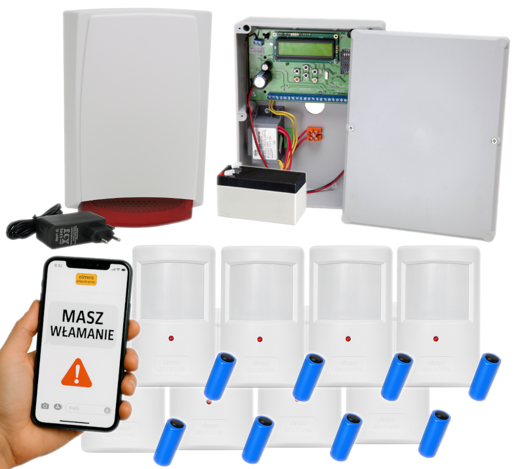 zestaw alarmowy Elmes oparty na centrali CBP32S to funkcjonalne i łatwe w obsłudze rozwiązanie dla domów, biur, sklepów, kiosków, warsztatów czy domków letniskowych. System łączy