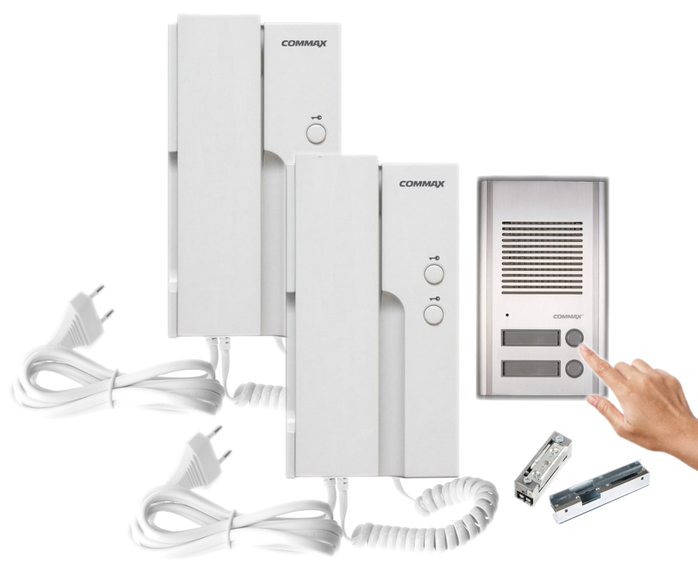 Zestaw domofonowy dwurodzinny Commax z 2 unifonami DP-2HPR 230V, stacją bramową DR-201AG oraz elektrozaczepem R4