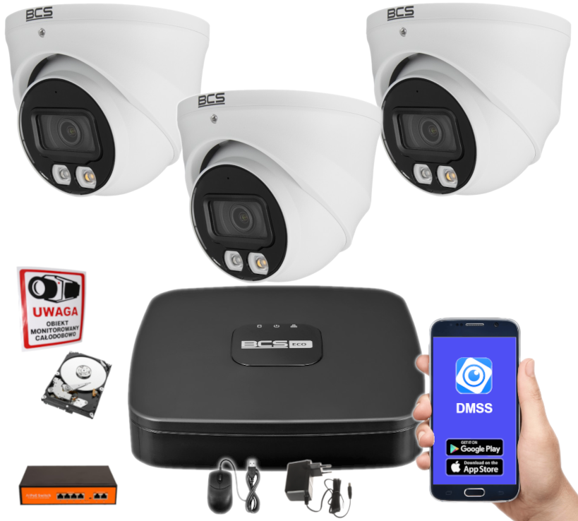 Zestaw monitoringu BCS umożliwia użytkownikowi samodzielny montaż w domu, biurze lub wszędzie tam, gdzie potrzebne jest bezpieczeństwo i nadzór. Zestaw ten jest wyposażony we wszystko, co niezbędne do stworzenia skutecznego systemu monitoringu, w tym kamery, rejestrator, switch PoE i dysk twardy 1TB.