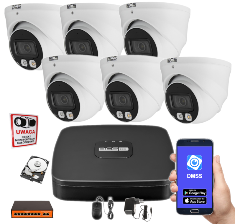 Zestaw monitoringu BCS umożliwia użytkownikowi samodzielny montaż w domu, biurze lub wszędzie tam, gdzie potrzebne jest bezpieczeństwo i nadzór. Zestaw ten jest wyposażony we wszystko, co niezbędne do stworzenia skutecznego systemu monitoringu, w tym kamery, rejestrator, switch PoE i dysk twardy 1TB.