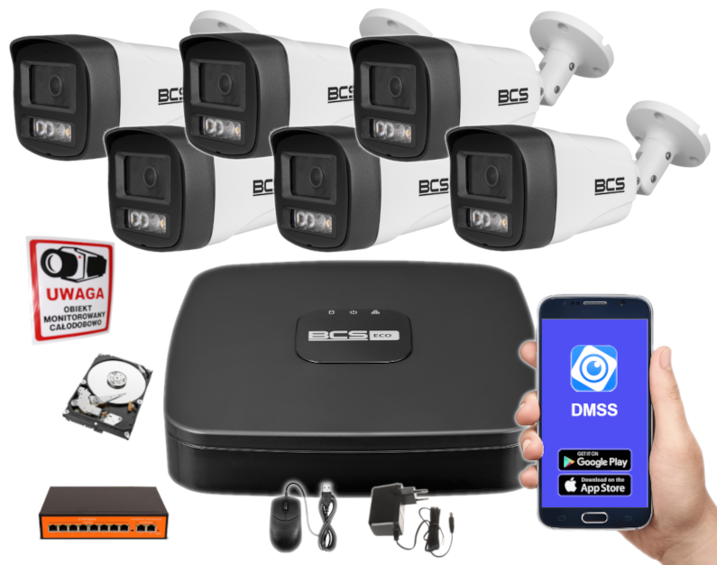 Zestaw monitoringu BCS umożliwia użytkownikowi samodzielny montaż w domu, biurze lub wszędzie tam, gdzie potrzebne jest bezpieczeństwo i nadzór. Zestaw ten jest wyposażony we wszystko, co niezbędne do stworzenia skutecznego systemu monitoringu, w tym kamery, rejestrator, switch PoE i dysk twardy 1TB.