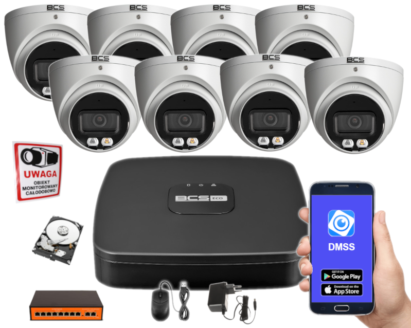 Zestaw monitoringu BCS umożliwia użytkownikowi samodzielny montaż w domu, biurze lub wszędzie tam, gdzie potrzebne jest bezpieczeństwo i nadzór. Zestaw ten jest wyposażony we wszystko, co niezbędne do stworzenia skutecznego systemu monitoringu, w tym kamery, rejestrator, switch PoE i dysk twardy 1TB.