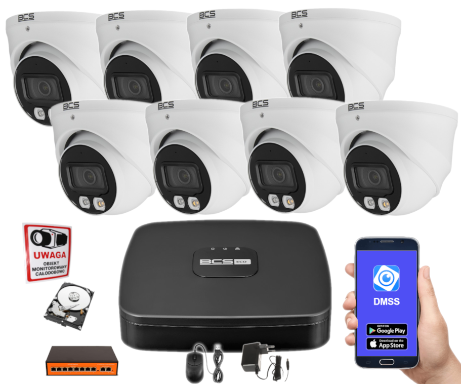 Zestaw monitoringu BCS umożliwia użytkownikowi samodzielny montaż w domu, biurze lub wszędzie tam, gdzie potrzebne jest bezpieczeństwo i nadzór. Zestaw ten jest wyposażony we wszystko, co niezbędne do stworzenia skutecznego systemu monitoringu, w tym kamery, rejestrator, switch PoE i dysk twardy 1TB.