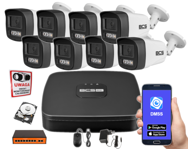 Zestaw monitoringu BCS umożliwia użytkownikowi samodzielny montaż w domu, biurze lub wszędzie tam, gdzie potrzebne jest bezpieczeństwo i nadzór. Zestaw ten jest wyposażony we wszystko, co niezbędne do stworzenia skutecznego systemu monitoringu, w tym kamery, rejestrator, switch PoE i dysk twardy 1TB.