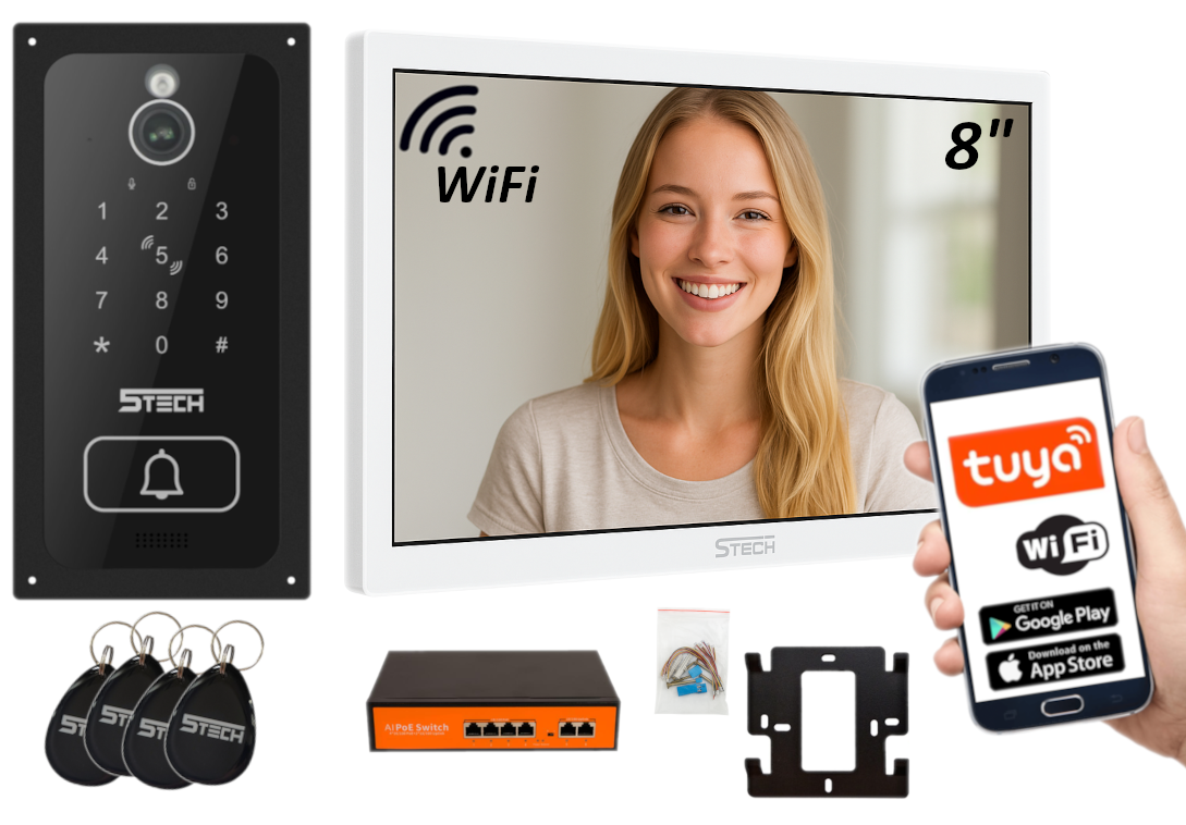 - aplikacja mobilna Tuya Smart – pełna kontrola nad elektrozaczepem i napędem bramy z dowolnego miejsca, poprzez smartfon (po uprzednim podłączeniu kasety do monitora, brak w zestawie),