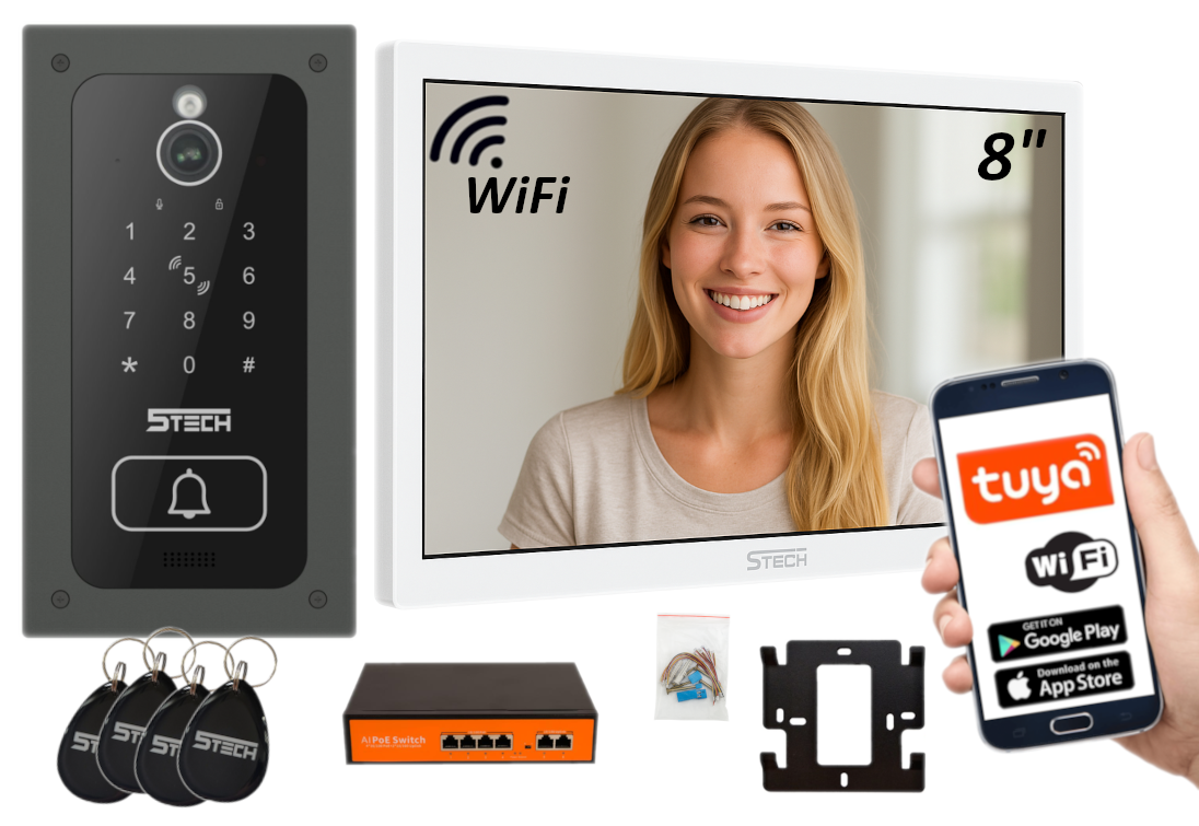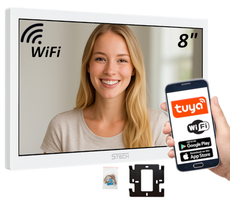 - aplikacja mobilna Tuya Smart – pełna kontrola nad elektrozaczepem i napędem bramy z dowolnego miejsca, poprzez smartfon (po uprzednim podłączeniu kasety do monitora, brak w zestawie),